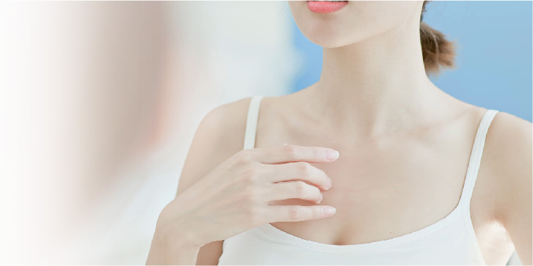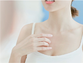 皮膚に微弱な電気を与えることで、バストアップ効果、美肌効果の高いバスト専用導入液を痛みを伴わずに肌の深部に導入。バスト専用液導入後、女性ホルモンに似た作用を持つ、大豆イソフラボンやコラーゲン、エラスチンを含むバストジェルを使用してマッサージすることで、リンパの流れも良くなり、胸元にハリ・透明感を与えます。バストの下垂を予防し、バストアップ効果が期待できます。